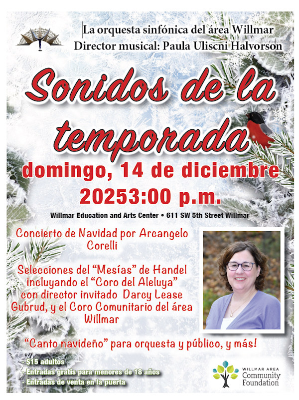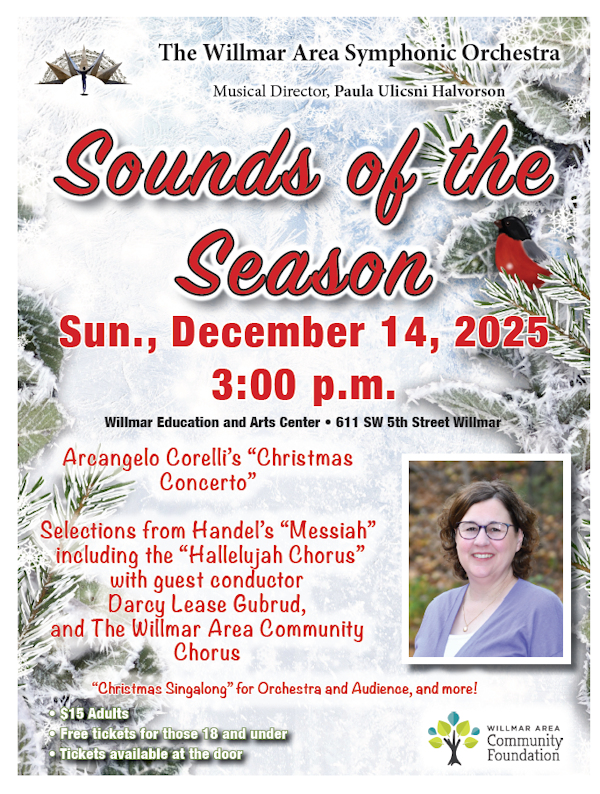 Special thanks to the Willmar Arts Fund of the Willmar Area Community Foundation for financial assistance and for supporting WASO. This orchestra is funded in part with a grant from the Southwest Minnesota Arts Council made possible by the voters of Minnesota, thanks to a legislative appropriation from the arts and cultural heritage fund.