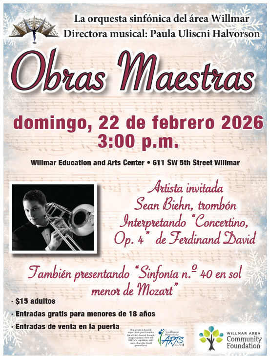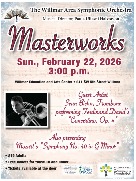 Special thanks to the Willmar Arts Fund of the Willmar Area Community Foundation for financial assistance and for supporting WASO. This orchestra is funded in part with a grant from the Southwest Minnesota Arts Council made possible by the voters of Minnesota, thanks to a legislative appropriation from the arts and cultural heritage fund.